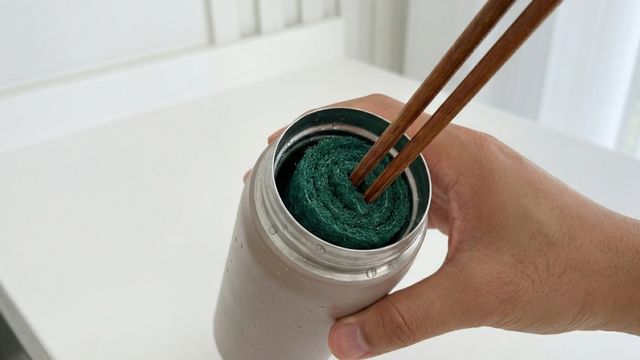 다음으로 칼집을 낸 수세미를 돌돌 말아준다. 잘 말리는 얇은 수세미라면 칼집 없이 말아주면 된다. 이후 말아놓은 수세미 중앙의 공간에 나무젓가락과 같은 긴 막대를 꽂아 넣는다. 마지막으로 고무줄을 이용해 수세미가 풀리지 않도록 단단히 묶어 고정하면 간이 세척 도구가 완성된다. 젓가락은 손잡이 역할을 하고, 수세미는 솔처럼 작용해 손이 닿지 않는 깊은 컵이나 텀블러 내부를 효과적으로 닦을 수 있다.