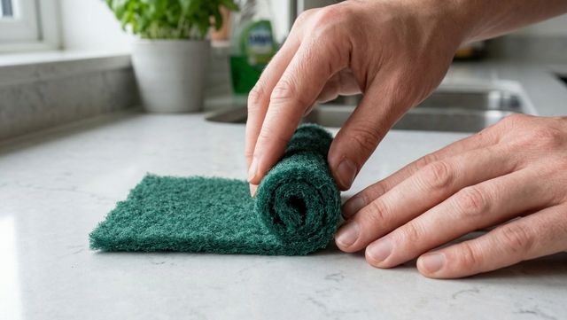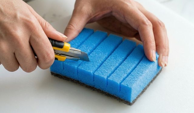 먼저 수세미를 준비한다. 스펀지형 수세미처럼 어느 정도 두께감이 있는 제품이라면 커터칼을 이용해 수세미에 네다섯 개 정도의 칼집을 낸다. 이때 완전히 잘라내지 않고 표면에 틈을 만드는 것이 핵심이다. 이렇게 하면 수세미가 더 유연하게 벌어진다.