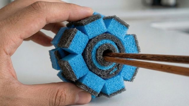 AI가 생성한 자료사진. 말아놓은 수세미 중앙의 공간에 나무젓가락과 같은 긴 막대를 꽂아 넣는다. 고무줄을 이용해 수세미가 풀리지 않도록 단단히 묶어 고정하면 간이 세척 도구가 완성된다.