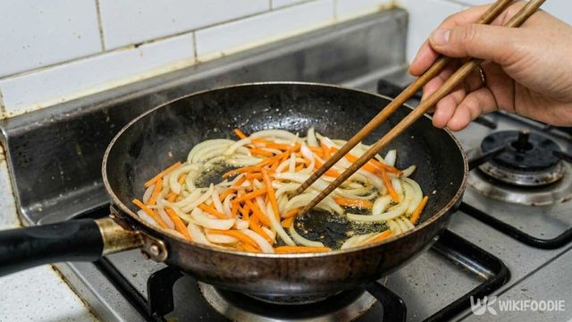 6. 달군 팬에 식용유를 두르고 양파와 당근을 먼저 볶다가 청고추·홍고추를 넣는다