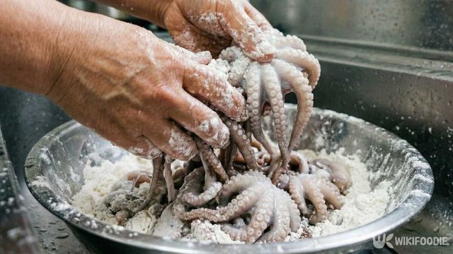 1. 주꾸미를 볼에 담고 밀가루 2~3큰술을 넣어 손으로 바락바락 문질러 씻은 뒤 흐르는 물에 깨끗이 헹군다