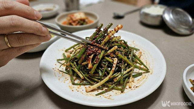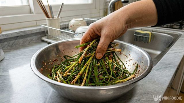 먹기 좋은 길이로 자른 쪽파에 양념을 넣고 손으로 가볍게 뒤집듯 섞으면 완성된다. 세게 비비지 않는 것이 중요하다. 그래야 쪽파가 풀어지지 않고 식감이 유지된다.