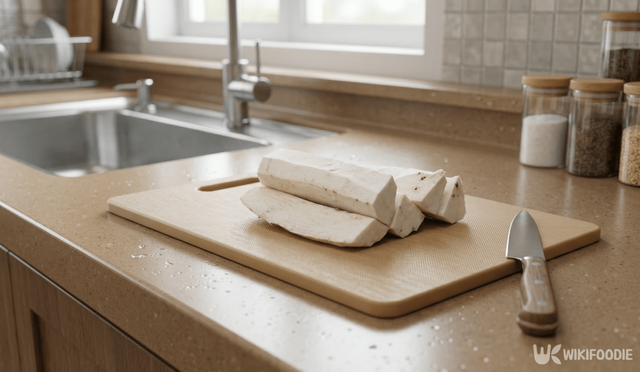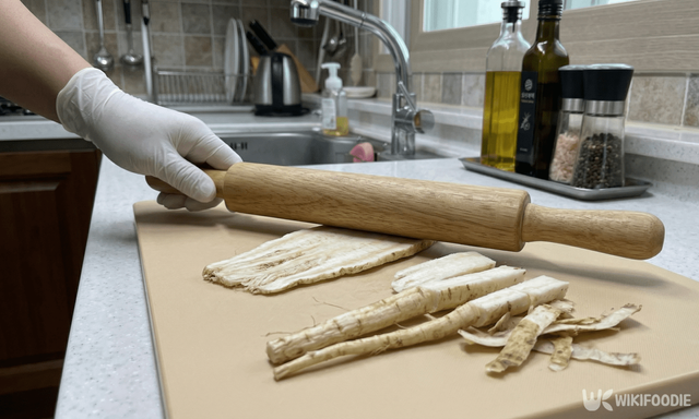 손질한 더덕은 결을 살려주는 과정이 필수다. 두툼하게 편 썰어준 뒤 밀대로 가볍게 두드려야 한다. 너무 세게 때리면 살이 뭉개지므로, 힘을 빼고 톡톡 쳐서 조직을 연하게 만든다는 느낌으로 작업한다. 이렇게 결이 생겨야 다음에 바를 기름과 양념이 속까지 깊게 스며든다.