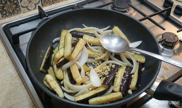 가지가 어느 정도 익으면 양파를 넣는다. 가지를 3분 정도 볶은 뒤 양파를 넣어야 양파의 아삭한 맛이 유지된다. 이어 고추와 파를 차례로 넣고 전체적으로 빠르게 볶는다.