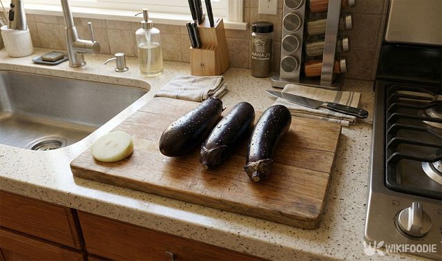 가지는 꼭지를 떼고 반으로 자른 뒤 3등분으로 썬다.