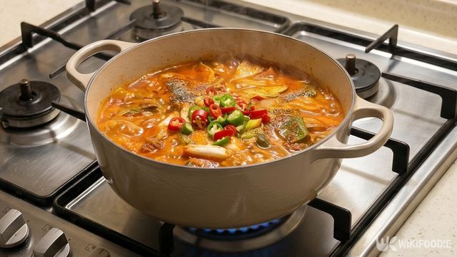 조리 중간에 위로 떠오르는 거품은 숟가락으로 정성껏 걷어낸다. 이 과정을 통해 텁텁하지 않은 맑은 국물이 만들어진다. 무가 젓가락으로 찔렀을 때 부드럽게 들어갈 정도로 익으면 대파와 고추를 넣는다.