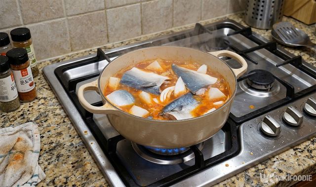 준비한 양념장을 무가 담긴 냄비에 먼저 풀고 끓인다. 국물이 보글보글 올라오면 채 썬 양파를 넣고 그 위에 고등어를 얹는다. 뼈를 제거한 필렛 형태는 일반 고등어보다 빨리 익으므로 불 조절에 유의해야 한다. 불이 너무 세면 살이 쉽게 부서지기 때문에 중불에서 천천히 졸여야 모양이 흐트러지지 않는다.