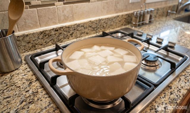 쌀뜨물 500ml를 붓고 무가 반쯤 익을 때까지 먼저 끓인다.