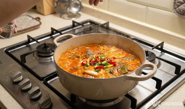 무가 부드러워지면 대파, 고추, 후춧가루를 넣고 한소끔 더 끓여 마무리한다.