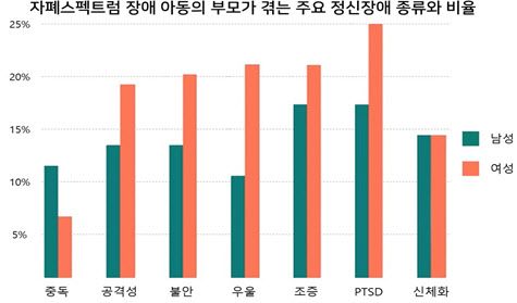 정신건강 유병률은 성별에 따라서도 차이가 있었다. 남성 22.8%, 여성 35.3%로 여성이 더 취약한 것으로 나타났다. 어머니는 불안과 우울, PTSD 등에서 유병률이 높았고, 아버지는 중독에서 유병률이 높은 경향을 보였다.