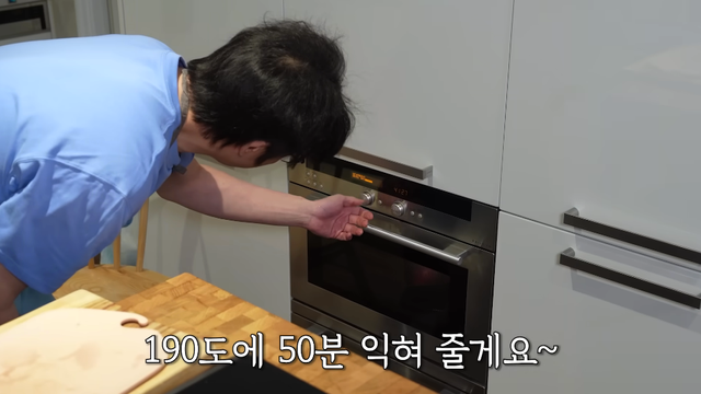 2. 오븐에 190도로 25~30분간 1차로 굽고, 꺼낸 뒤 얼음물에 약 2분간 담근다. 이때 고구마 표면에 기포가 올라오는 모습을 확인할 수 있다. 다시 190도에서 25~30분 한 번 더 구워 마무리한다.