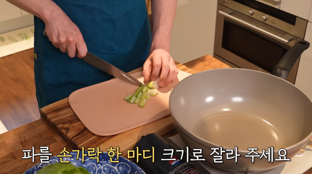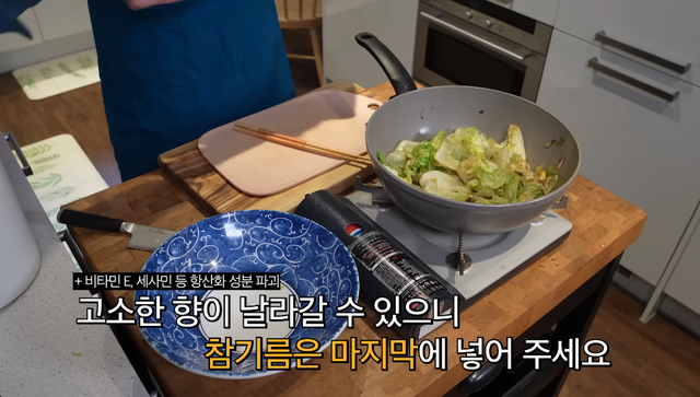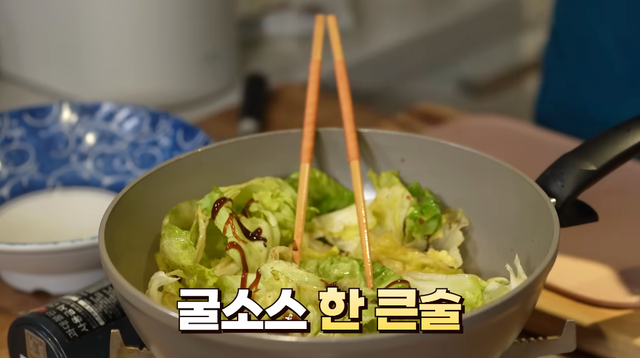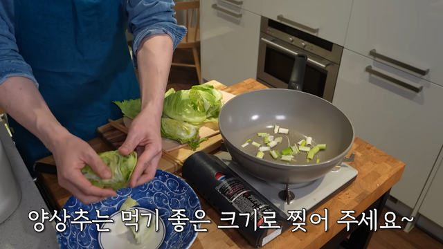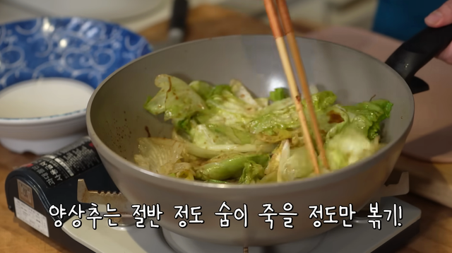 1. 식용유를 두른 웍에 손가락 한 마디 크기로 썬 파를 먼저 굽고, 간장 한 큰술을 더해 향을 낸다. 여기에 먹기 좋게 찢은 양상추를 넣어 함께 볶는다. 성시경은 쥐똥고추를 더하면 풍미가 살아난다며 추가를 권했다.