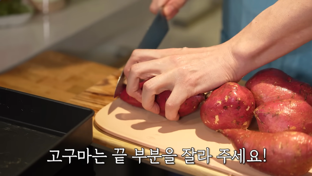 1. 고구마를 깨끗이 세척한 뒤 양 끝을 잘라내고, 가운데에 칼집을 넣는다. 이후 껍질을 쉽게 벗기기 위한 과정이다.