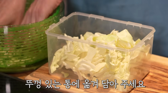 1. 양배추의 겉잎을 정리한 뒤, 먹기 좋은 사각 형태로 썬다. 깨끗하게 세척한 후 물기를 충분히 제거하고, 밀폐 가능한 넉넉한 통에 담는다.