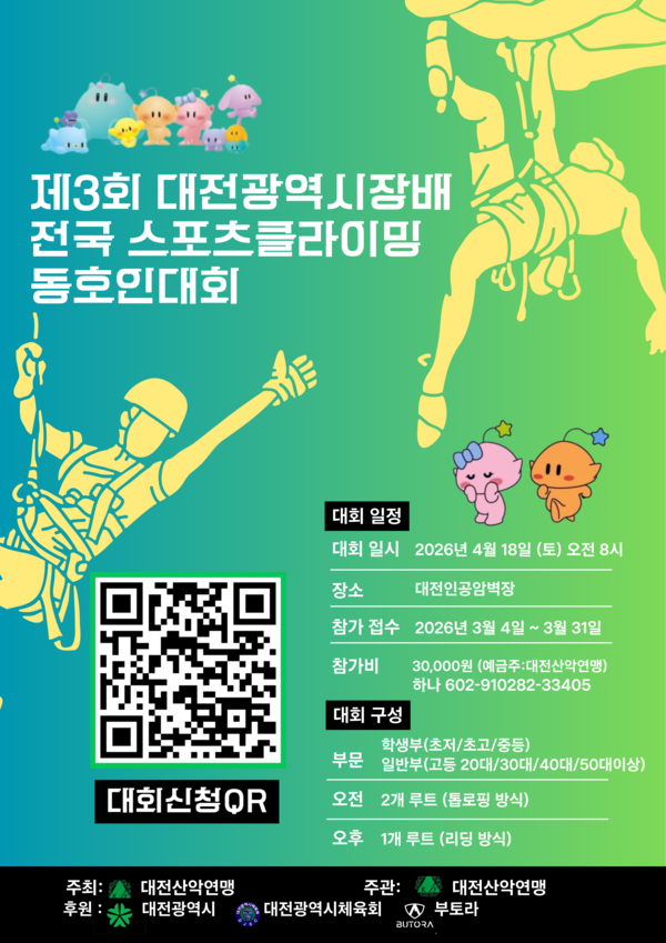 전국 스포츠클라이밍 동호인들의 축제인 ‘제3회 대전시장배 전국 스포츠클라이밍 동호인대회’가 오는 18일, 대전유성인공암벽장에서 개최된다.