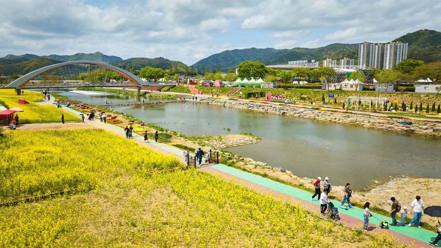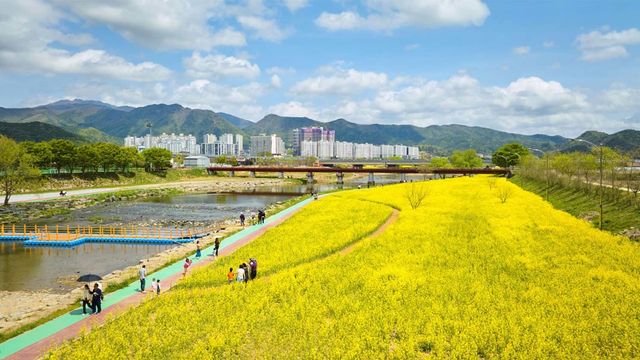 화순 꽃강길을 걸어본 사람이라면 안다. 하천을 따라 2.1km 남짓 이어지는 이 길이 얼마나 화사한지. 화순 봄꽃 축제는 안 그래도 예쁜 이 꽃강길을 벽라교부터 삼천교까지 약 6ha(약 1만8150평) 규모의 대형 꽃 단지로 탈바꿈시킨다. 유채꽃 500만 주가 한꺼번에 피어오르는 광경은 말로 설명하기보다 두 눈으로 확인하는 편이 낫다. 노란 물결이 하천 양쪽을 가득 메운 풍경, 화순의 봄이 이렇게 넓다.