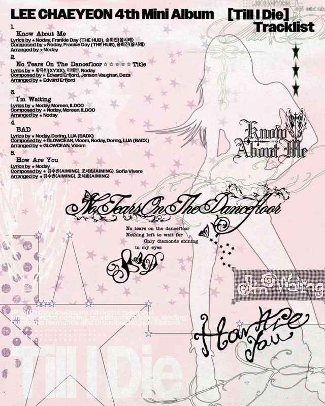 이채연의 소속사 데이원드림(DayOneDream)은 15일 오후 6시 공식 SNS 채널을 통해 이채연의 미니 4집 ‘Till I Die(틸 아이 다이)’ 트랙리스트 이미지를 공개했다.