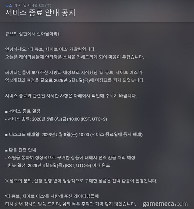 ▲ 더 큐브, 세이브 어스 서비스 종료 결정 발표 공지 (자료출처: 스팀 공식 페이지)