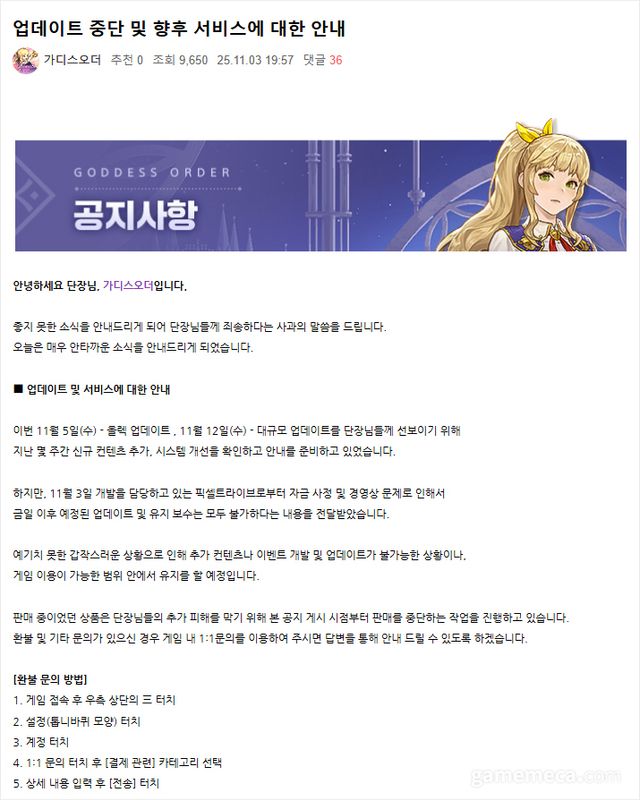 ▲ 출시 한 달 만에 업데이트 중단이 발표됐던 가디스오더 (사진출처: 게임 공식 커뮤니티)