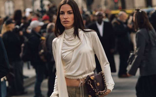 조이 크라비츠의 이 룩은 패턴도, 요란한 로고도 없는 심플한 셔츠와 팬츠의 조합이지만 뭔가 특별해 보이죠. 비밀은 소재에 있습니다. 단추를 깊게 풀어 V넥으로 연출한 초콜릿 브라운 셔츠는 은은하게 빛을 반사하는 실키한 새틴 소재, 그 아래 블루 팬츠는 미세한 주름과 반짝이는 텍스처가 살아있는 독특한 크레이프 소재로 풍부하게 표현했죠. 여기에 셔츠나 팬츠에 톤을 맞추는 대신 밝은 옐로 컬러의 낮은 키튼 힐을 매치해 룩에 위트 있는 반전을 더했습니다.