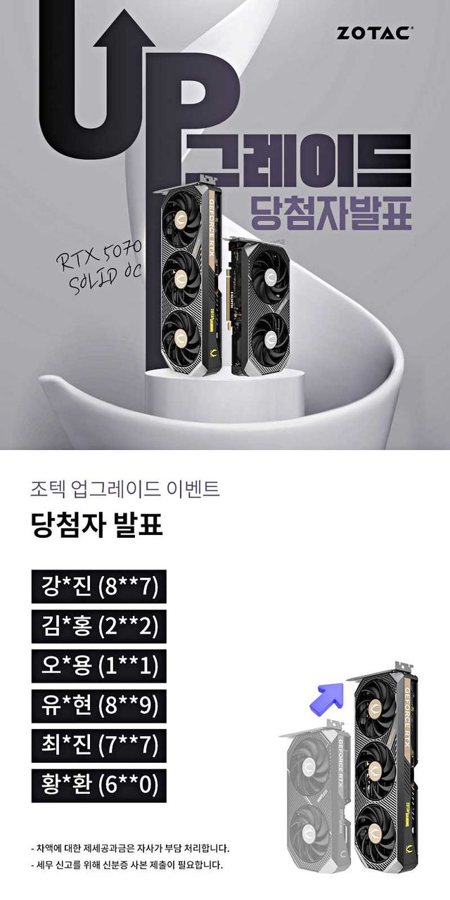 ZOTAC Korea has wrapped up its RTX 5070 upgrade promotion for buyers of the RTX 5060 Ti 8GB series. Due to strong participation, the company doubled the number of winners from three to six, offering selected customers an upgrade to the ZOTAC GAMING GeForce RTX 5070 SOLID OC.