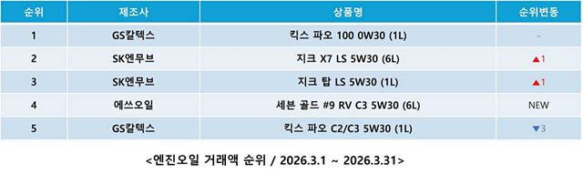소비자 수요는 검증된 브랜드 제품에 집중됐다. 3월 엔진오일 거래액 상위권에는 GS칼텍스 킥스 파오 100 0W30, SK엔무브 지크 X7 LS 5W30, SK엔무브 지크 탑 LS 5W30, 에쓰오일 세븐 골드 #9 RV C3 5W30, GS칼텍스 킥스 파오 C2/C3 5W30 등이 이름을 올렸다.