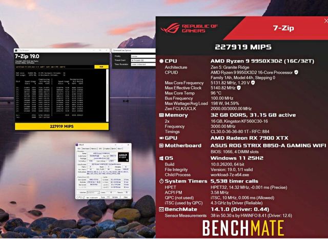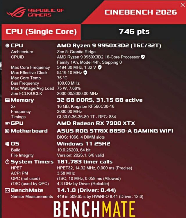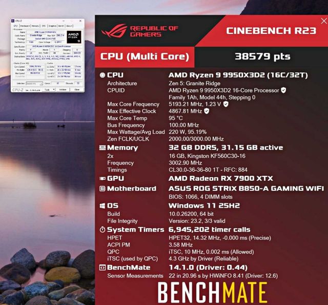 테스트 시스템은 ASUS ROG Strix B850-A Gaming WiFi 메인보드, DDR5 32GB 메모리, 라데온 RX 7900 XTX 그래픽카드로 구성됐다. 벤치마크 등록자는 불가리아 사용자로 알려졌으며, 냉각 솔루션은 공랭 방식으로 추정된다. 다만 AMD 기본 쿨러인지, 별도 사제 공랭 쿨러인지는 확인되지 않았다.