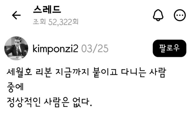 [평범한미디어 박효영 기자] 어김 없이 마주하게 된 4월 중순의 어느날이다. 세월호 참사가 일어난지 12년이 흘렀다. 여전히 세월호에 대한 폭력은 존재한다. 스레드에서 ‘김폰지’라는 가명을 쓰는 사람은 “세월호 리본 지금까지 붙이고 다니는 사람 중에 정상적인 사람은 없다”고 주장했다.