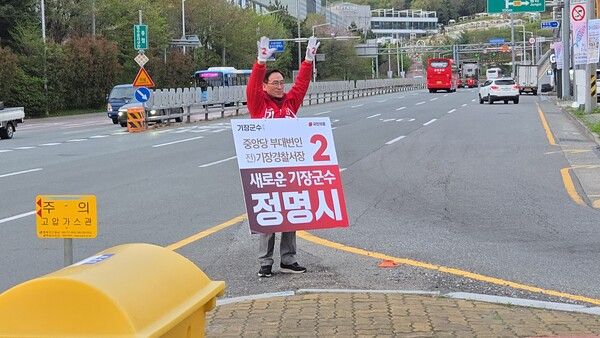 국민의힘 정명시 기장군수 예비후보가 정관읍의 한 도로에서 지나가는 운전자들과 군민들에게 인사를 하고 있다. /정명시 캠프