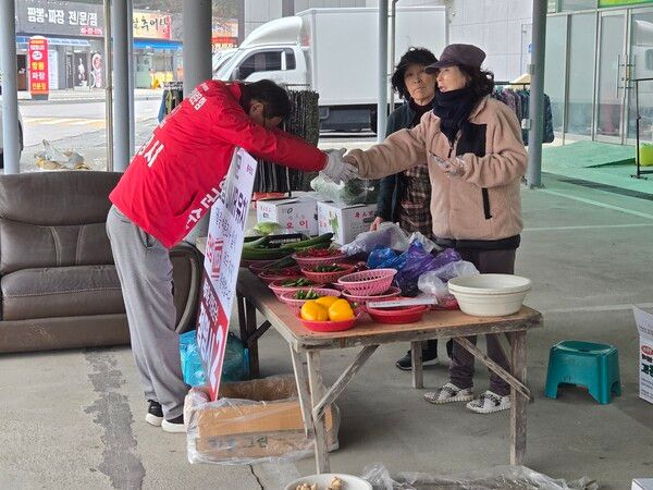 국민의힘 정명시 기장군수 예비후보가 정관읍의 한 재래시장에서 상인에게 인사를 하고 있다. /정명시 캠프