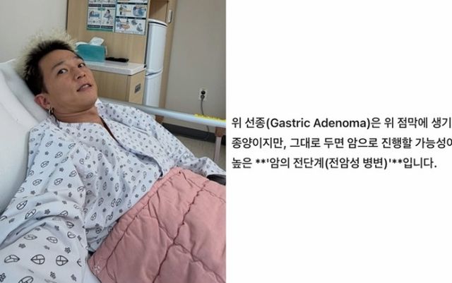 이와 함께 팝핀현준은 “위 선종은 위 점막에 생기는 양성 종양이지만, 그대로 두면 암으로 진행할 가능성이 매우 높은 ‘암의 전단계(전암성 병변)’입니다”라는 설명이 담긴 화면을 캡처해 게재, 입원 사유를 간접적으로 밝혔다.
