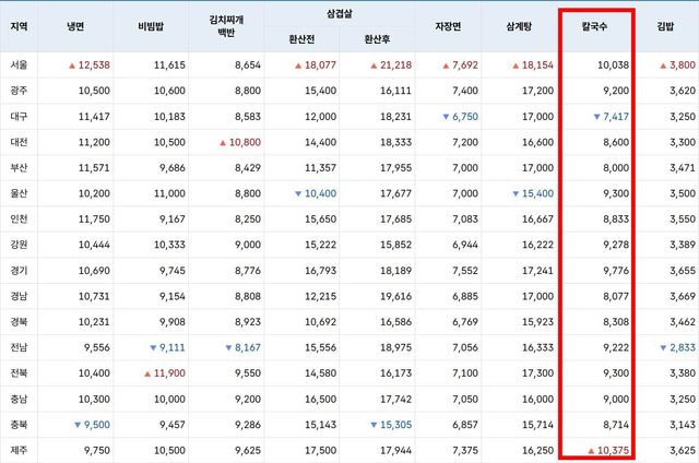 전국 16개 지역 데이터를 보면 지역마다 가격 편차가 상당하다. 칼국수의 경우 제주(1만375원)가 서울(1만38원)보다 오히려 비쌌다. 반면 대구는 7417원, 충북은 8714원으로 서울과 2000~3000원 가까이 차이가 났다. 같은 칼국수 한 그릇인데 지역에 따라 가격이 40% 가까이 벌어지는 셈이다.