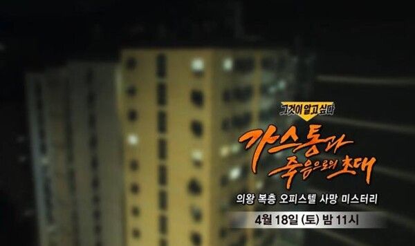 18일 밤 방송되는 SBS 그것이 알고 싶다 1484회에서는 가스통과 죽음으로의 초대 - 의왕 복층 오피스텔 사망 미스터리 편을 통해, 실종된 10대 소녀를 수색하는 과정에서 우연히 드러난 또 다른 여성의 죽음과 그 이면에 숨겨진 진실을 추적한다.